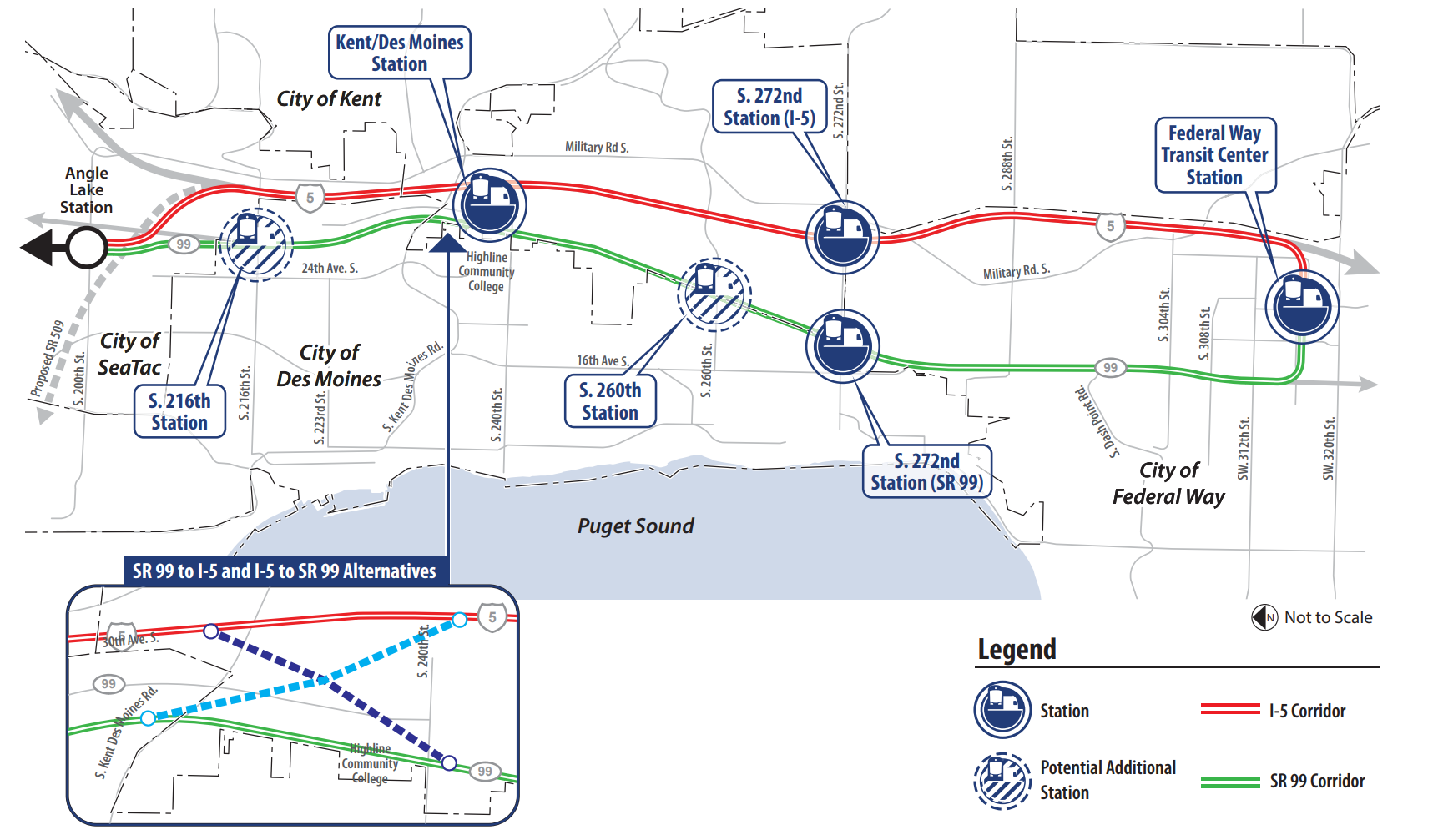 Federal Way Link will remain one of the biggest examples of a missed opportunity for many Puget Sound transit advocates. From Angle Lake Station, Pacific Highway S — a segment of State Route 99 — seems like a natural choice as a pathway for continuing south, and was considered by Sound Transit as the agency mulled its options for getting to Federal Way. But Kent, Des Moines, and Federal Way all united around the idea of routing the alignment closer to I-5.