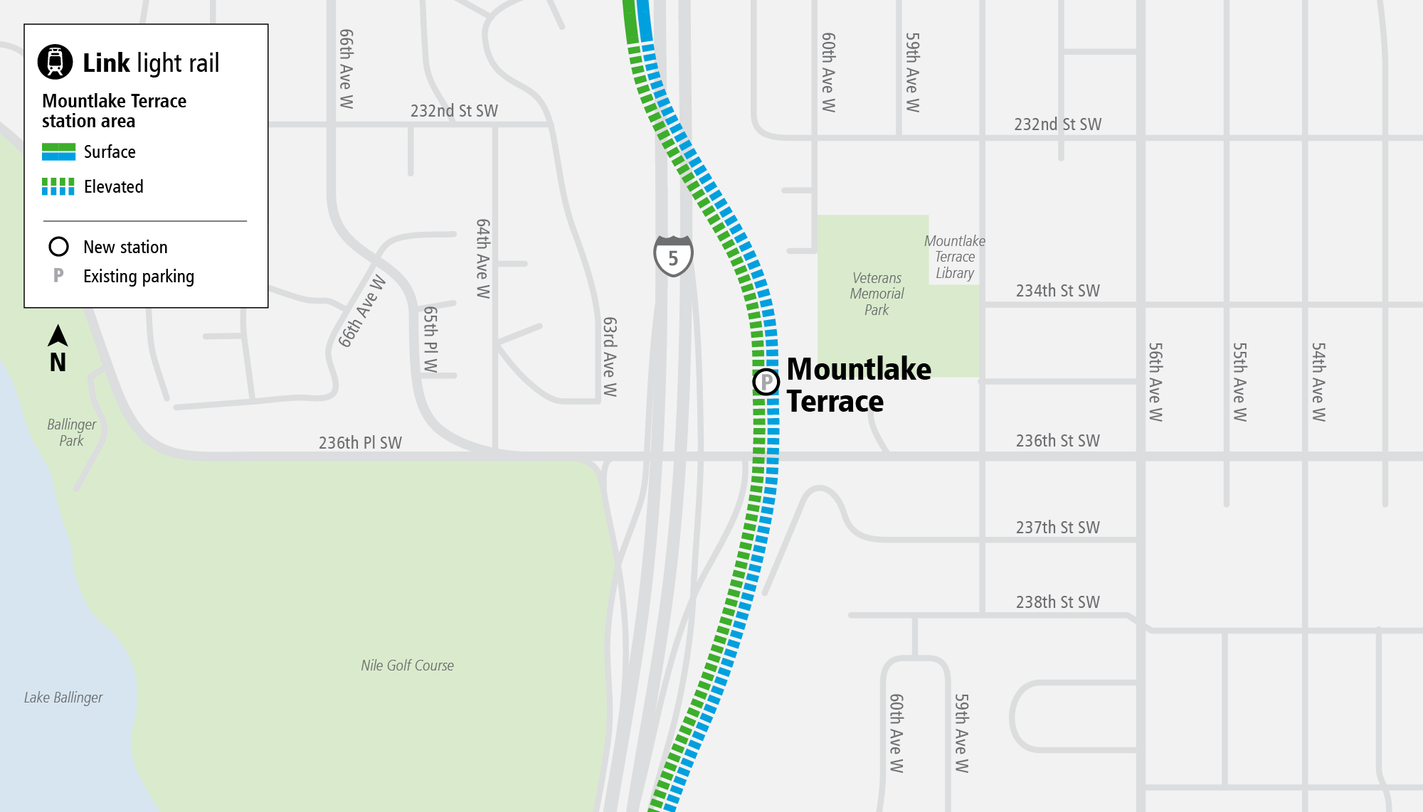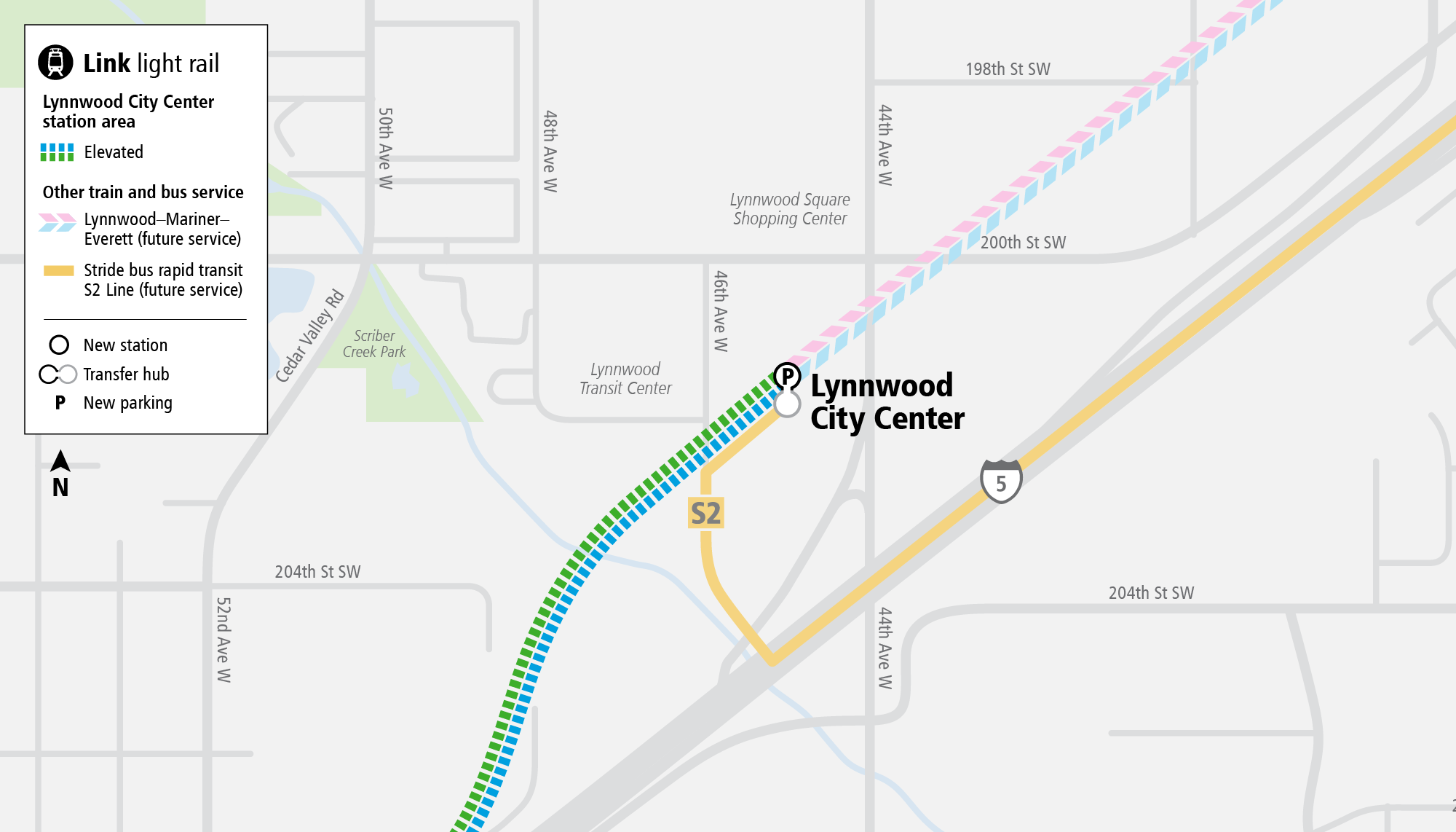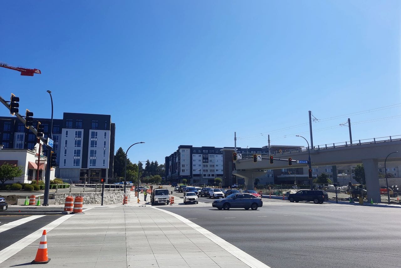 Lynnwood Link traces the path of I-5, with the first three stations on the east side of the freeway, and Lynnwood City Center on the western side. As urbanists are wont to tell you, freeway proximity comes with significant downsides, from the air and noise pollution to the fractured walkshed, making it harder to walk, roll, or bike to the station. A freeway bisecting the station area will make it harder to grow a thriving urban neighborhood, but the cities along the line have taken some steps to mitigate the challenges and are making some strides nonetheless. The high quality bus feeder networks local transit agencies have added at each station should spread the benefits of light rail across a wider area.