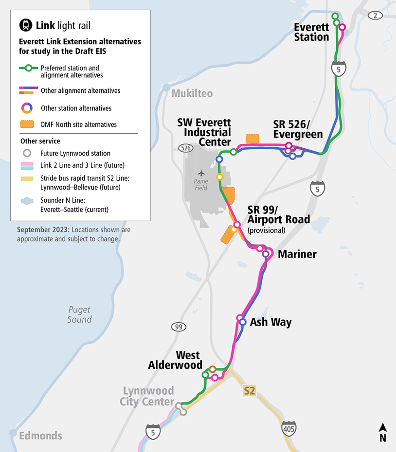 The 1 Line will extend north to Everett from today’s terminus at Lynnwood City Center in 2037, at least according to current Sound Transit plans. As part of that six-station extension, Lynnwood will get a second station dubbed “West Alderwood” at the edge of the Alderwood Mall. Unincorporated Snohomish County is also getting some love with stations at the park and rides at Ash Way and at Mariner. Everett will get the next three stations, including a station near Paine Field and Boeing’s Everett Production Facility via a circuitous dogleg away from the I-5 corridor the line otherwise tracks.