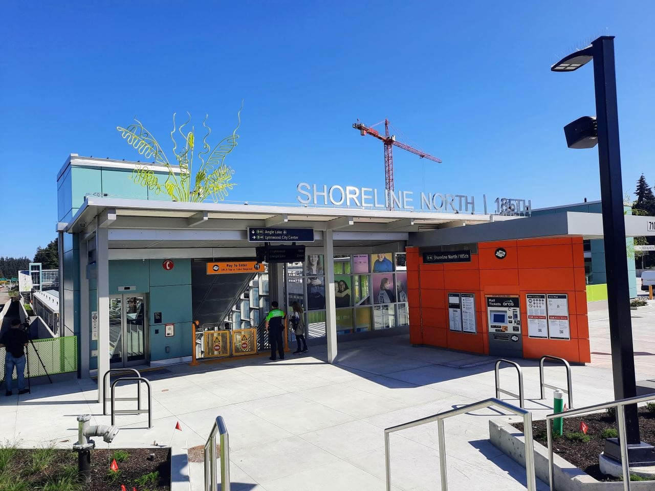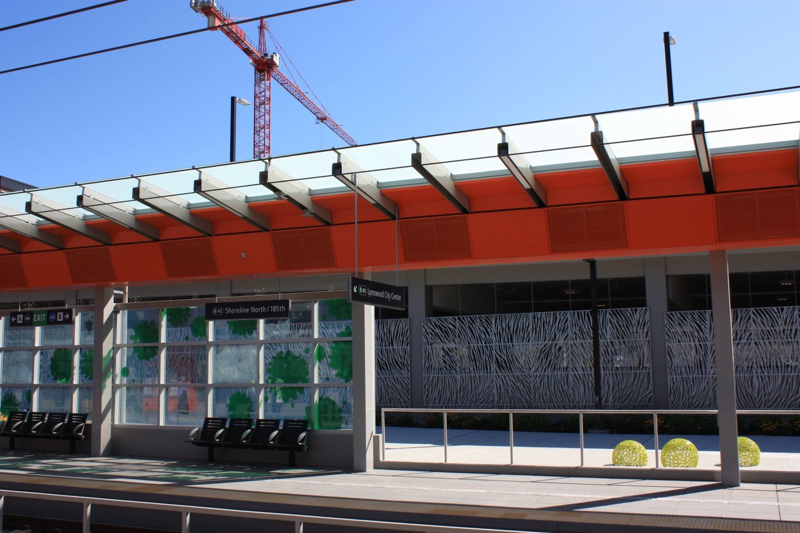 Shoreline North’s station art includes a nod to science fiction writer Octavia Butler (who lived nearby in Lake Forest Park) in the fold of green blobs adorning the otherwise orange station platform, creating an alien landscape.