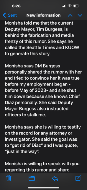 The Urbanist obtained a copy of an email, dated November 11, 2024, sent by Tompkins to Le and OIG Inspector General Lisa Judge in which Tompkins said she wanted to share some new information pertinent to the investigation. She said she spoke with former Deputy Mayor Monisha Harrell, who told her Deputy Mayor Tim Burgess personally shared the rumor of Tompkins and Diaz’s affair with her and was, according to the email, “behind the fabrication and media frenzy of this rumor.”