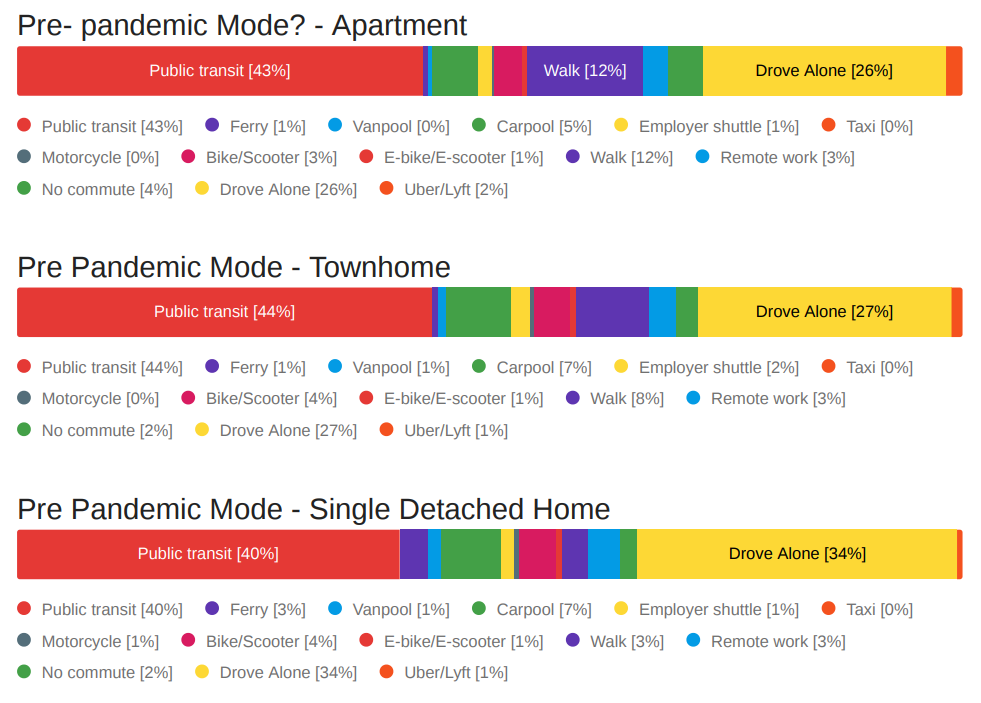 Before the pandemic, transit use was relatively high across the board for folks heading into Seattle’s downtown core. All three segments — apartment/condo, townhomes, and detached single-family homes — all were at 40% or greater for using transit to get to work.