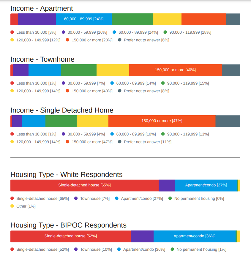 Income and race differences are also pronounced between single family homeowners and apartment and condo residents. The survey found 47% of single family households make at least $150,000 versus only 20% in the multifamily segment. Meanwhile, 65% of White respondents live in single detached housing versus 52% of Black, Indigenous, and people of color (BIPOC) respondents.