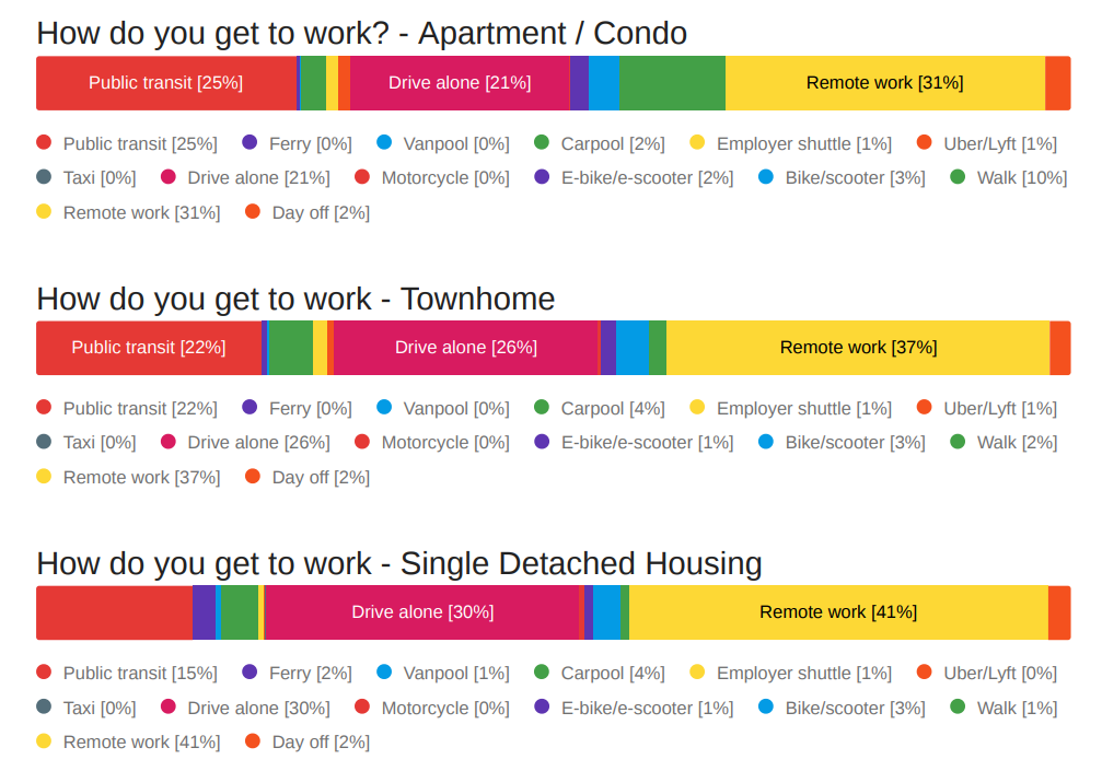Differences in walking rates and telework rates are striking. Ten percent of people who live in apartments walk to work, but just 1% of people who live in single detached housing and 2% of townhome residents. Telework has become very common among single family home residents at 41%, but less so for apartment dwellers at 31%.