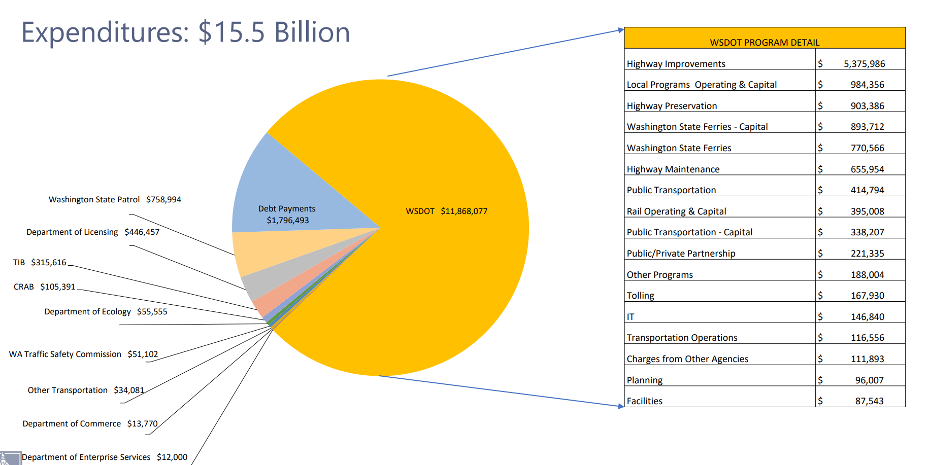 Debt service payments already eat up nearly 12% of the state transportation budget, thanks to past transportation packages approved by the legislature that relied on bonding. That’s more than the entire Washington State Ferries budget, and more than double the amount currently spent on state support for public transportation.