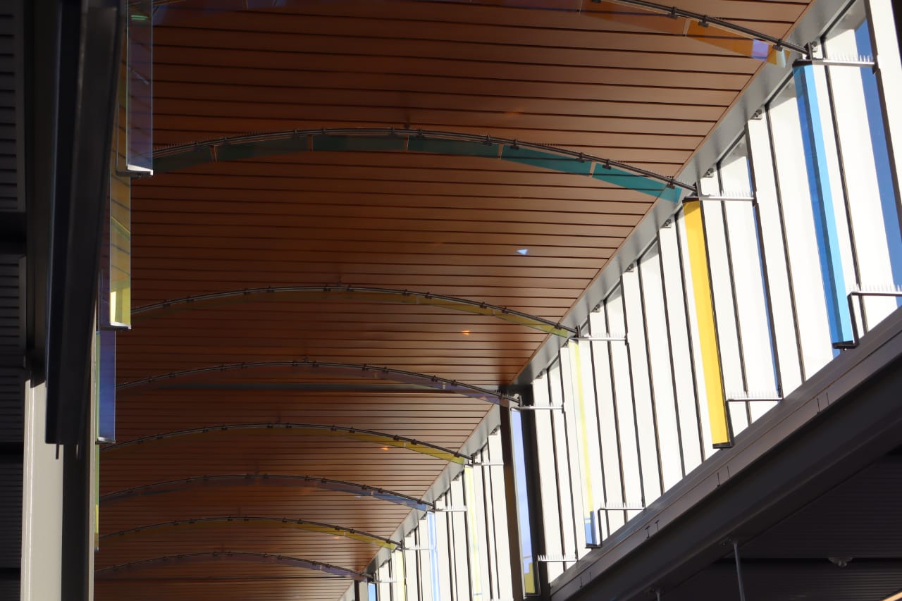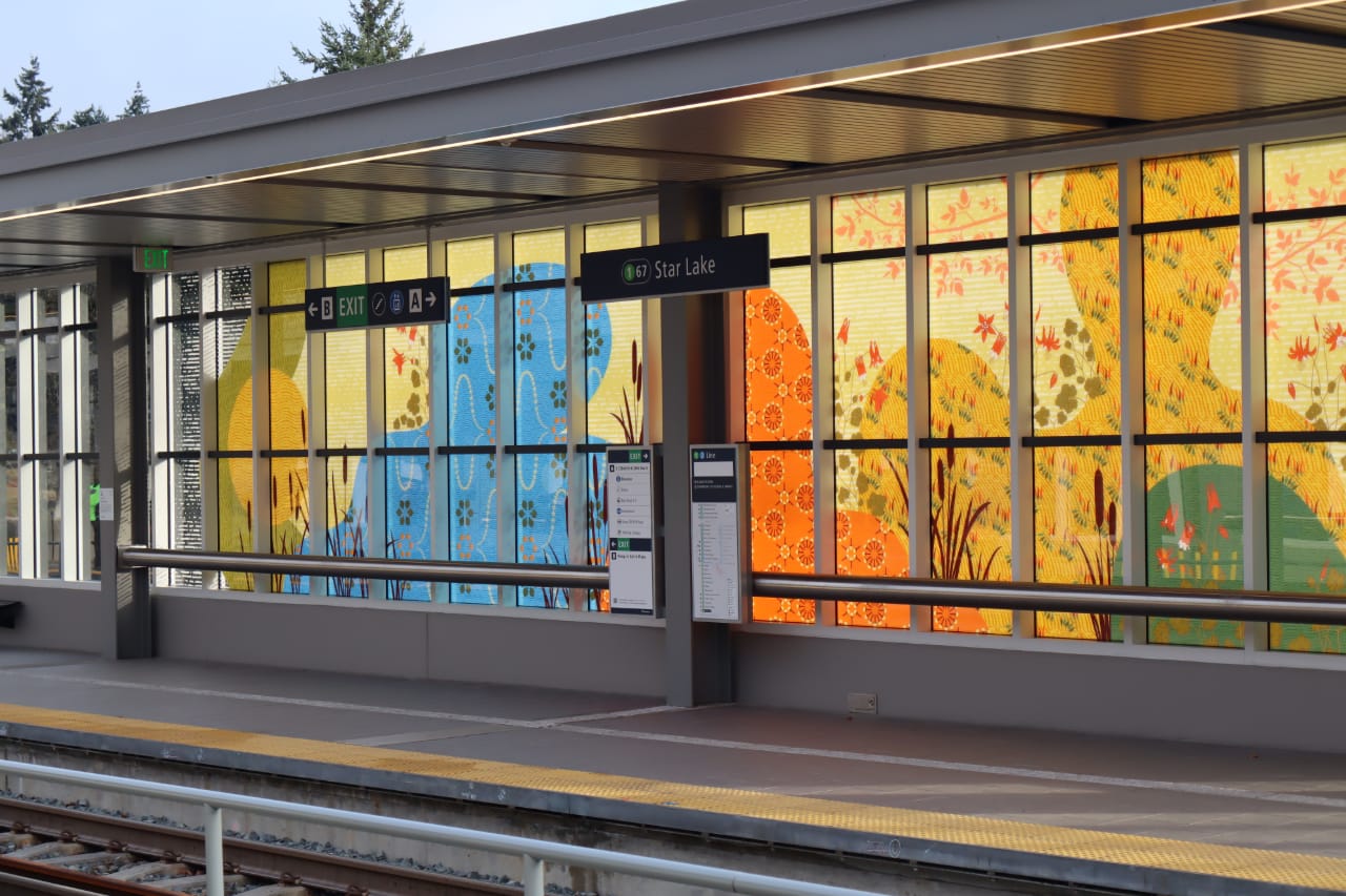 The most striking feature at Kent Des Moines Station is the artwork on the glass at the platform level: a piece called “Cambium.” It was created by Houston-based RE:site Studio. The tree branches etched into the glass climb toward the center of the station, mimicking the arc of the escalators that bring riders up from street level.