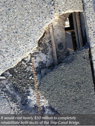 But repairing and replacing the interstate comes at a high cost as well, which is why even as notable signs of deterioration have emerged, such as the two by four foot hole that appeared in the Ship Canal Bridge last summer, government and transportation agencies have been relatively hushed about the risks posed by the interstate.