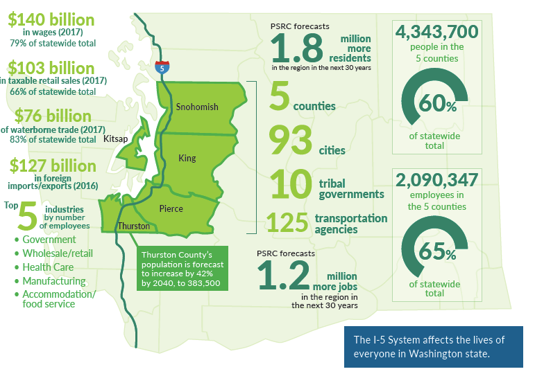 The ports of Tacoma and Seattle represent the fourth-largest container gateway in North America and carry over 10 million tons of freight per year, resulting in over $73 billion in international trade. By providing freight access, the I-5 system is a “critical lifeline for the region’s booming economy” and supports over 48,000 jobs across the state.