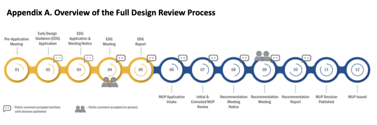 Such a suggestion is bold. In the case that it does not gain traction, additional legislative recommendations have put forth, including making online design review meetings permanent, creating a hybrid administrative design review option that would allow for public comment, streamlining design review guidelines using a race and social justice framework and emphasizing climate goals, examining fees charged through design review by city planners to increase accountability and track time spent, and more.