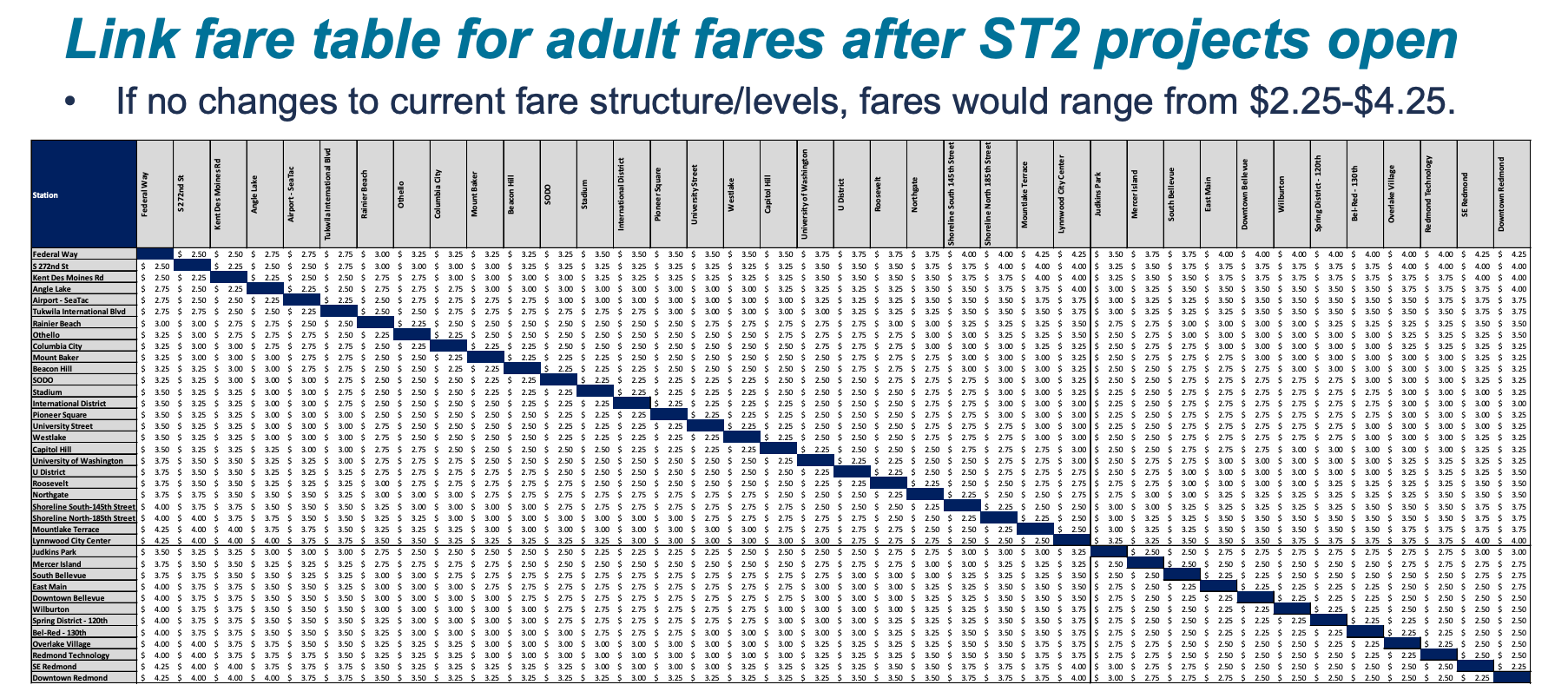 As to regional integration, no fare policy will be perfectly integrated with other agencies because fares are all over the map. King County Metro has a $2.75 flat fare and honors the $8 ORCA systemwide day pass, whereas Pierce Transit charges $2 per ride or $5 for an all-day pass, and Snohomish County’s Community Transit charges $2.50 per ride for local service and $4.25 for its commuter lines — the latter are not on the ORCA day pass. Everett Transit charges $2 per ride. Sound Transit’s Sounder commuter rail service ranges from $3.25 to $5.75 based on distance. That $5.75 fare is for the Lakewood to Seattle trip, which will actually be about the same distance as riding end-to-end on the future Tacoma-to-Ballard line. For some mysterious reason, we’re planning to charge a distance-based $5.75 for the longest Sounder trip but a flat $3.25 for Link trips that will be even longer.