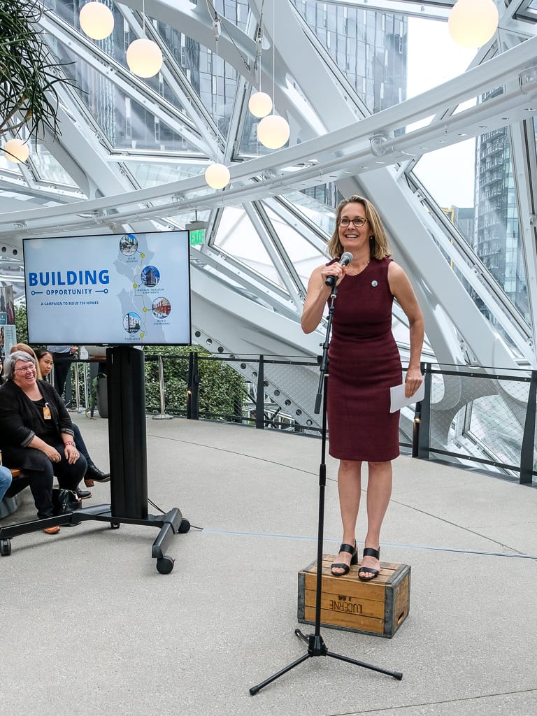 And if the idea of investing in affordable housing captures the public imagination, there is always the opportunity expand the fund’s reach. “We have a pipeline of 750 more homes,” said Susan Boyd, CEO of Bellwether Housing, to an enthusiastic crowd of tech professionals and affordable housing advocates at the fund’s launch party in the Amazon Spheres. Event speakers also included Seattle Mayor Jenny Durkan, Cameron Keegan of Tech 4 Housing, and Alex Hudson of the Transportation Choices Coalition.