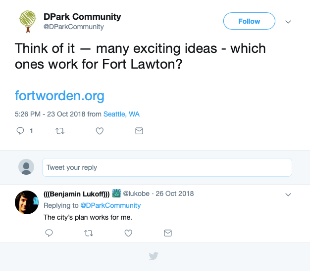 The group has generally promoted formally annexing Fort Lawton into Discovery Park, but an October 2018 tweet from DPCA shows they are open to other options for redevelopment as well, as long as they do not involve sharing the land with low-income neighbors.