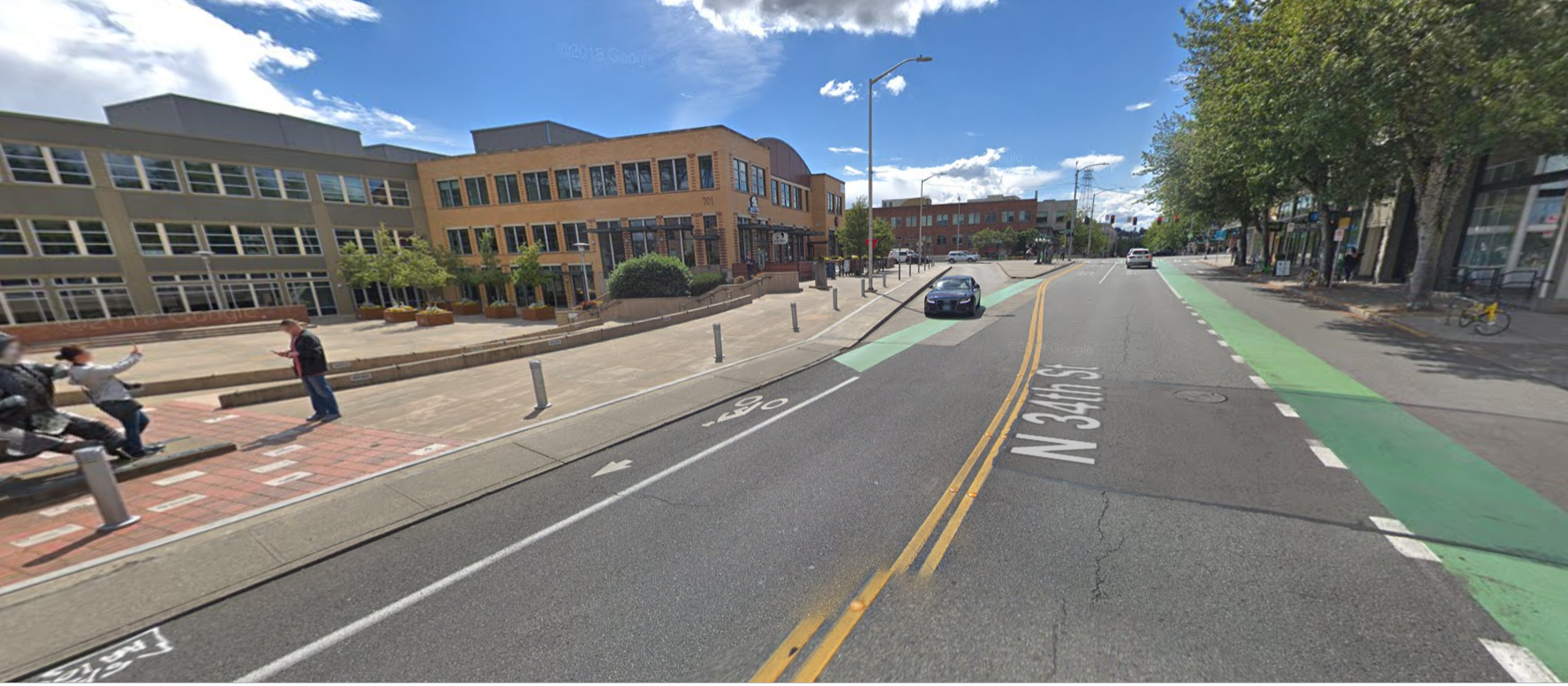 The project corridor is planned to be fairly narrow, from Fremont Ave N to Stone Way N. The street currently has a bike lane in each direction with no formal separation, but the bike lanes are marked. The bike lanes connect with existing facilities like the Burke-Gilman Trail at Stone Way N and a two-way cycletrack on the west side of N 34th St that leads to another Burke-Gilman Trail access point at Phinney Ave N.