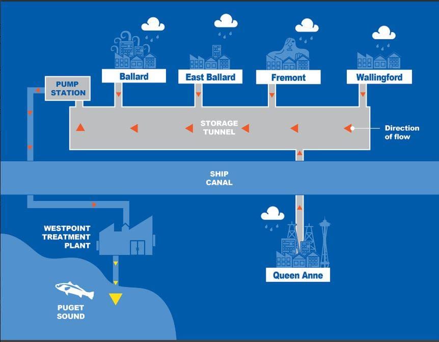 We can start with the basics: a house and the four routes used to move waste away. Now, I do not live in a house that looks like this, but the diagram is going to get busy, so let’s keep it simple. Solid waste–compost, recycling, and garbage–are taken by truck to various public and private transfer stations. Compost goes to Cedar Grove, a private composting facility. Recycling is handled by private firms. Garbage goes to landfills: Seattle by train to Columbia Ridge Landfill in Oregon; King County by truck to Cedar Hills Landfill. Sewage is carried by pipe to a regional wastewater treatment plants, three operated by King County or three others operated by smaller sanitation districts. Much of Seattle relies on a system that also carries stormwater through the same pipes. That’s why a subway tunnel sized cistern is being drilled under Ballard and Fremont right now.