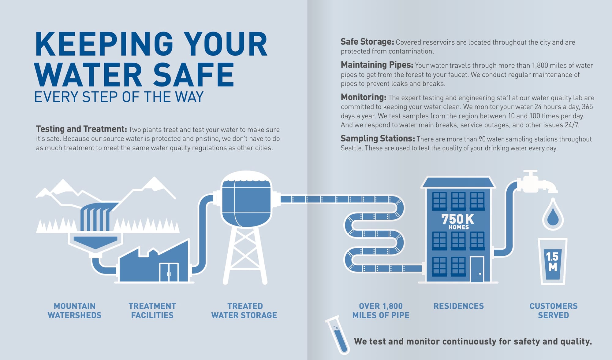 One last very important connection between these facilities. Let’s extend that water coming out of the mountains, through developed land, and meeting the discharges of the wastewater treatment plants. Federal and state law requires that the discharges meet stringent requirements for removal of contaminates. Reports from these agencies show that King County’s facilities meet or exceed the legal requirements. The arrow here is not to suggest malfeasance. It’s to show how that discharge sits at the precarious end of a complex and interconnected network. Heavy rain or a power flicker will overflow the treatment plants and put untreated sewage into local waterways, as happened this week.