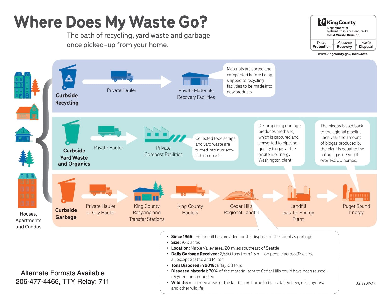 This diagram has some significant gaps. First, there’s not a measure of proportionality. By weight, as much material goes into the landfill as are recycled and composted combined. Also, the amount of electricity produced by Cedar Hills powers about 19,000 homes, or a little less than 2% of the homes in King County. And there are significant questions about the volume of material actually being recycled. A proportional diagram would scale up images and arrows to reflect this concepts.