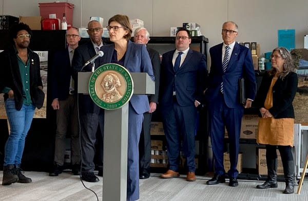 At the press conference, Inslee was flanked by State Rep. Nicole Macri (D-Seattle – 43rd District); Marc Dones, head of the King County Regional Homelessness Authority (KCRHA); Roger Millar, secretary of the Washington State Department of Transportation (WSDOT); Brett D’Antonio, CEO of Habitat for Humanity Seattle-King County & Kittitas; and Lisa Daugaard, executive director of Public Defender Association. Speakers praised the approach WSDOT has used to get people at encampments rapidly housed so the encampments can be removed without displacing people to set up new encampments elsewhere.