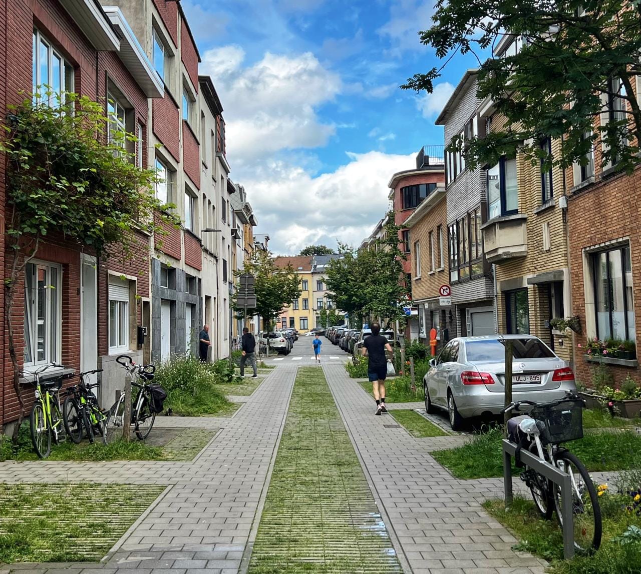 The Shared Streets Law has the greatest potential in residential settings, especially in places that lack sidewalks. Antwerp, Belgium is building entire networks of garden streets, one of which is shown below. These are streets governed by Belgium’s woonerf law where the focus is improving safety while adding greenery and removing impervious surfaces.