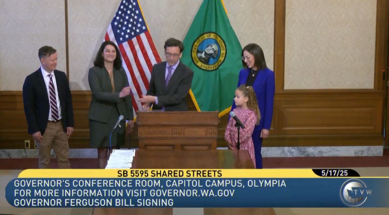 You might be surprised to learn it is illegal for a city in Washington State to set a speed limit lower than 20 miles per hour, but it’s true. The top speed of many e-bikes is essentially the minimum speed limit for cars on any public street. However, starting on July 27th, that will change. Under Senate Bill 5595, signed on Saturday by Governor Bob Ferguson, Washington cities will have the legal authority to create a new type of street that features much lower speed limits and puts pedestrians first.
