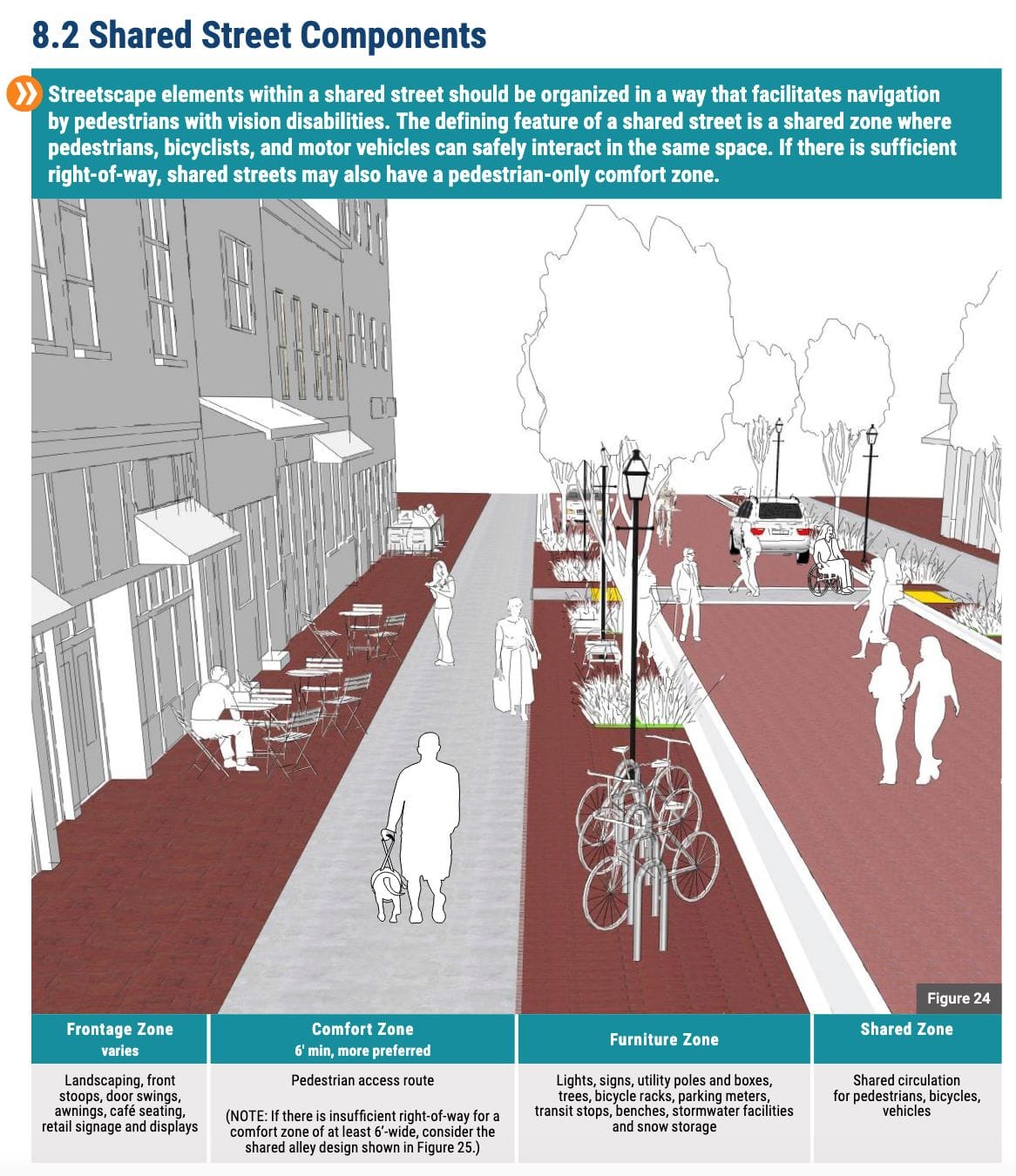 That publication is focused on making shared streets more navigable by people with vision impairments but it covers a range of physical attributes and considerations that benefit all users. The examples show shared roadways that are too wide and lack the kind of physical barriers like bollards that provide the most comfort for pedestrians in shared environments but the document highlights a number of useful features: