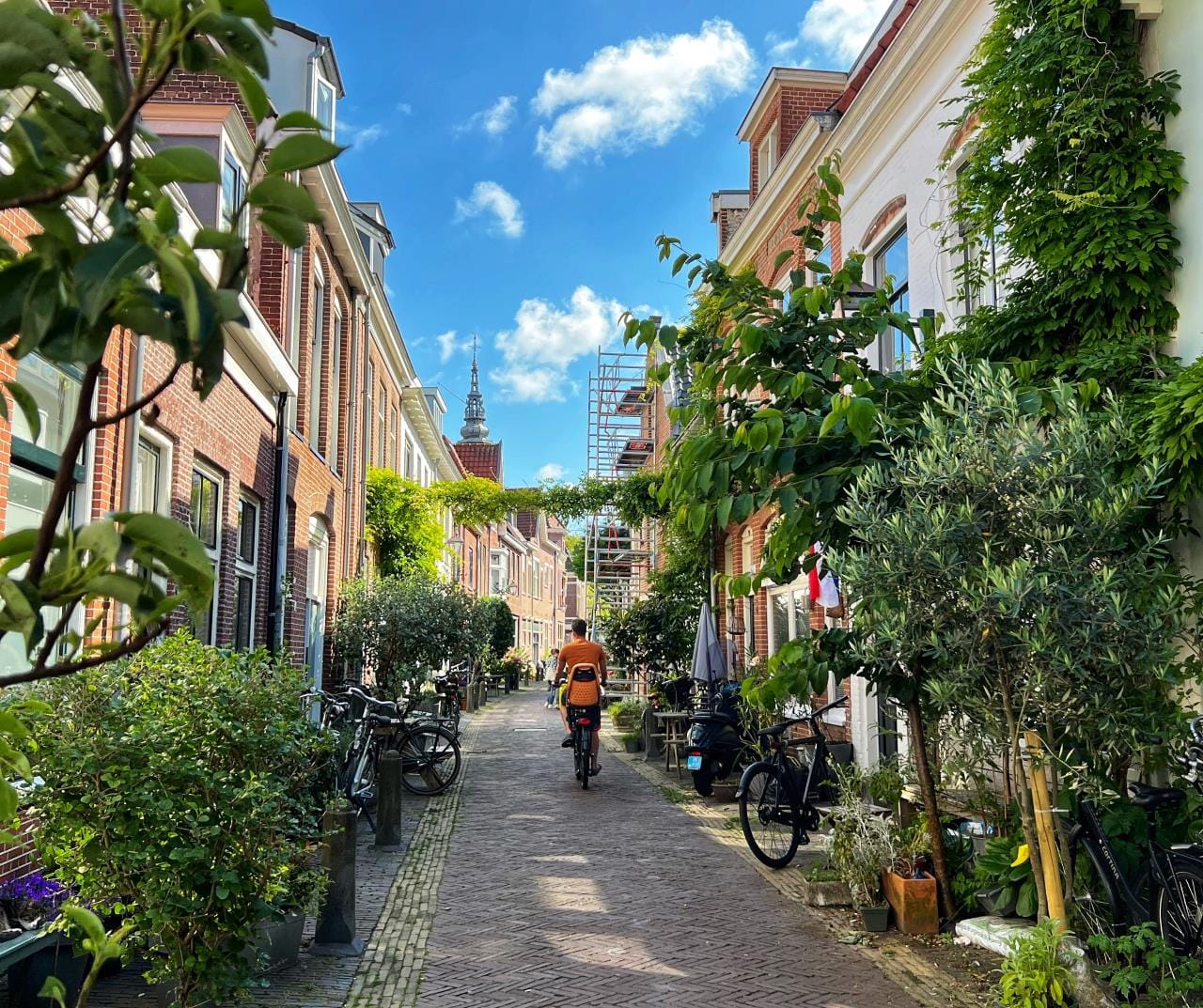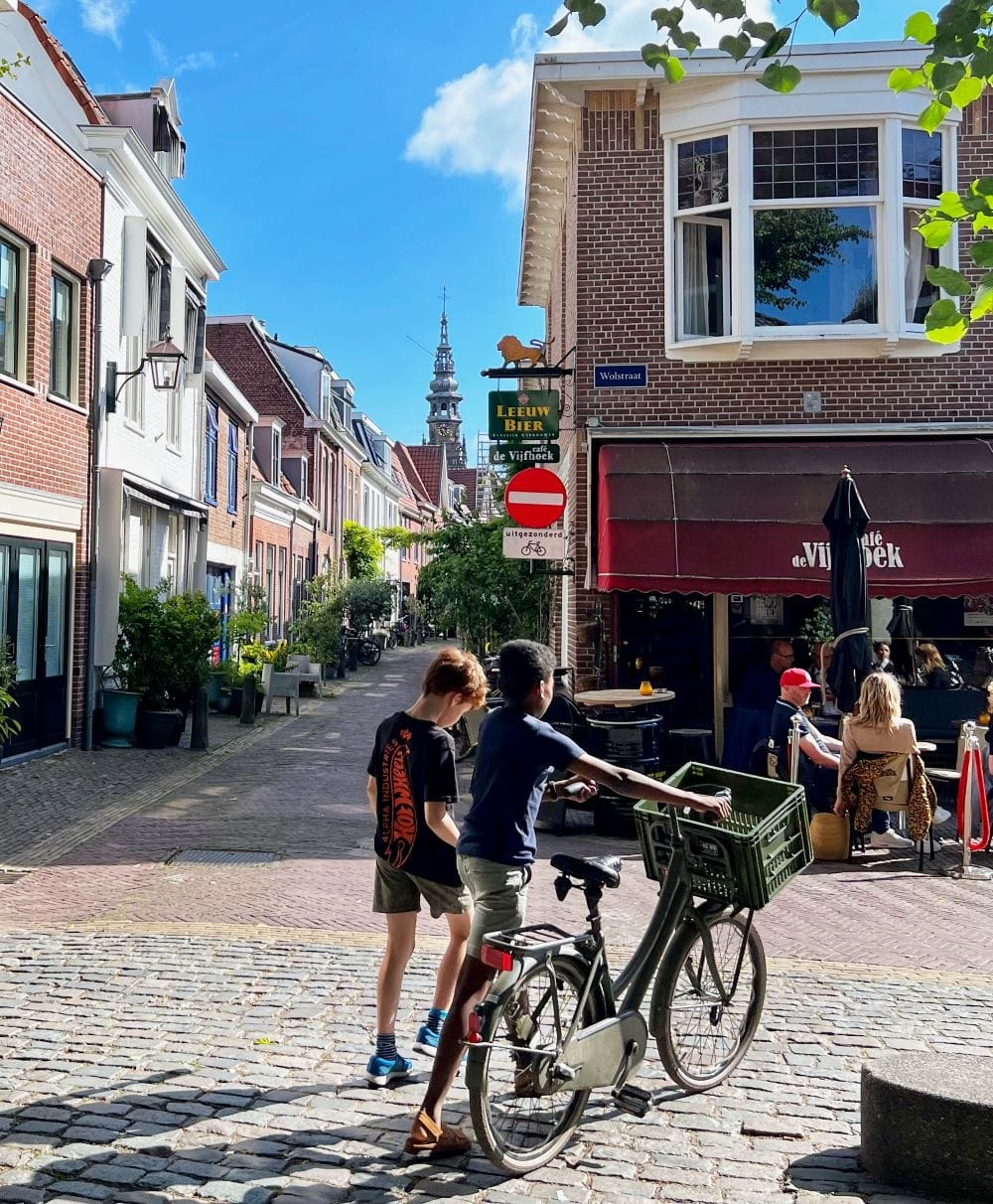A classic European shared street or “woonerf” is narrow and curbless with a clear zone suggested by paving materials and personal items like tables, chairs, and planters along the edges. It may also include bollards and other hardscape materials that protect personal items and provide refuge for pedestrians when the occasional car needs to inch past. The physical attributes of a shared street can vary.