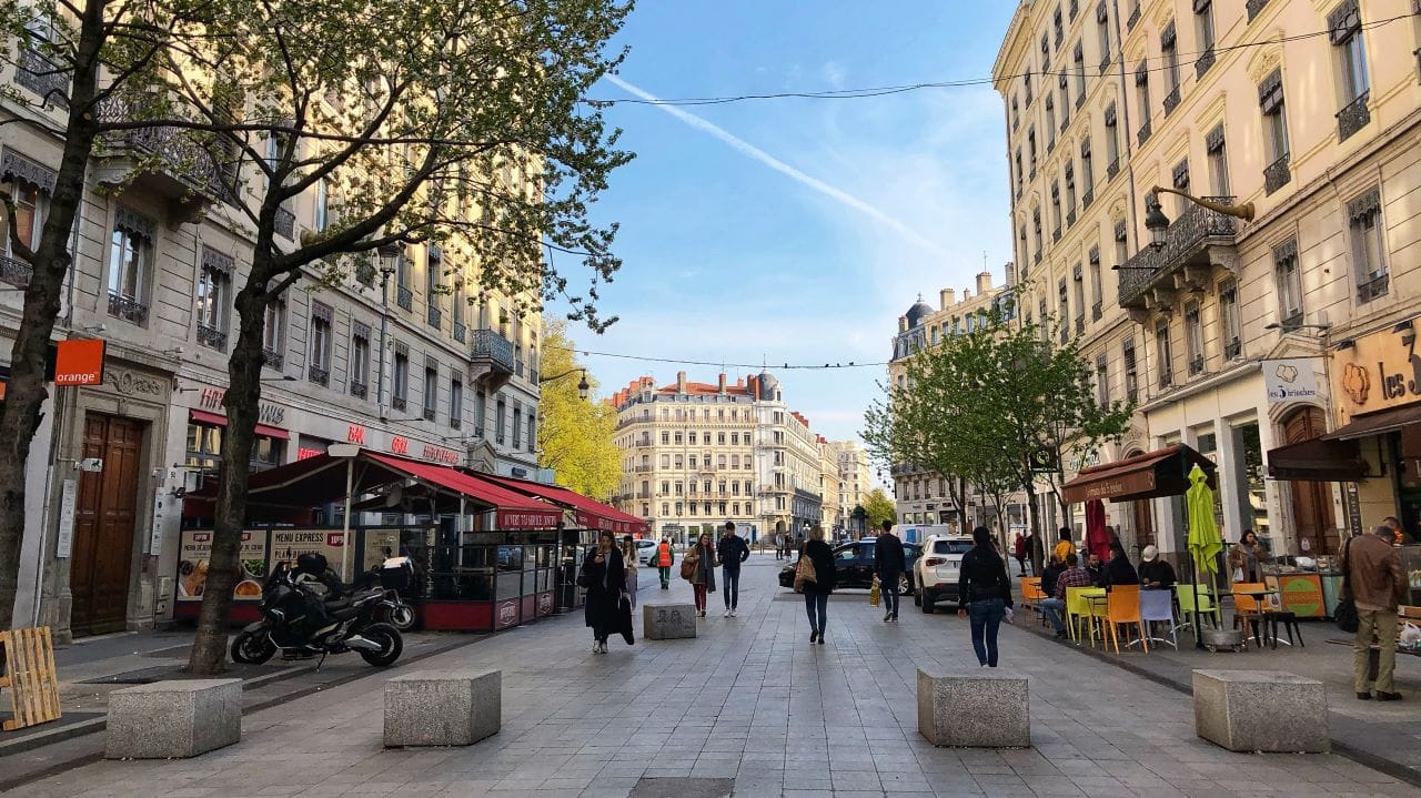 Shared streets are compatible with a range of urban environments. Rue de la République in Lyon, France, shown below, is considerably wider than the Dutch woonerfs above. This street could be successful if it were fully pedestrianized but the local authorities have decided to maintain vehicular access. The granite obstacles and active pedestrian land uses along the edges encourage very slow speeds. In addition, mapping apps have been advised to route vehicular traffic around it.