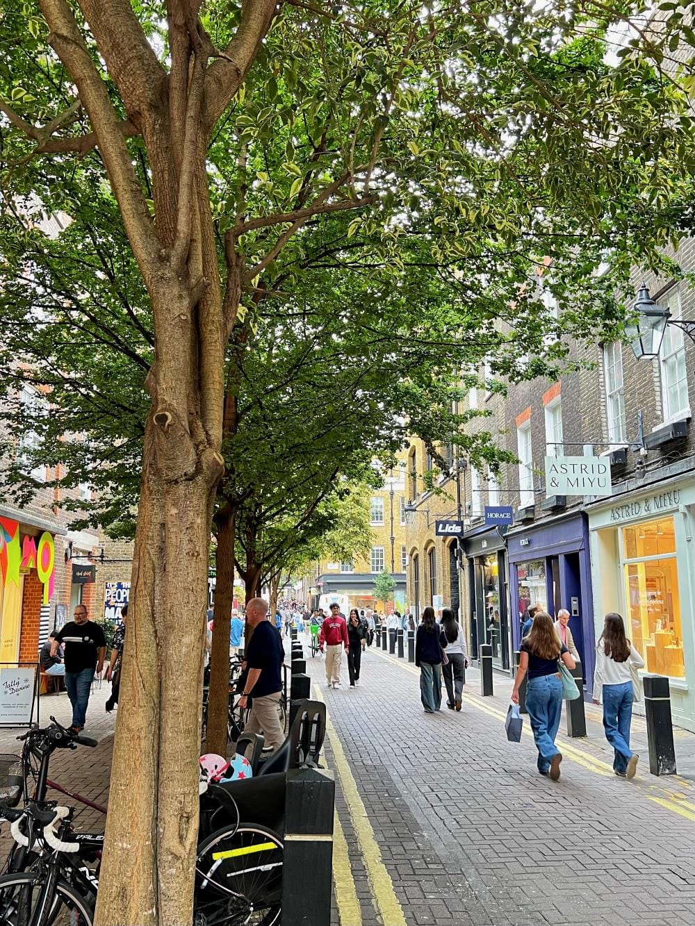 So, that can mean eliminating curbs but it also requires features to reduce traffic volumes, slow speeds, and provide refuge for pedestrians. The Seven Dials district in London provides an excellent example. The shared portion of the roadway is narrow. Pedestrians can cross the roadway wherever they like and can walk down the center, but there are significant areas, protected by well-spaced bollards, where pedestrians can find refuge. Trees are a bonus.