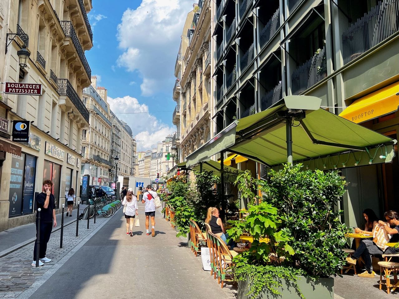 Rue Cadet in Paris, below, is a variation on the Seven Dials example. In terms of regulation, this street is pedestrian-only but allows service vehicles with no time limitations and the speed limit is set at 18.6 miles per hour (30 kilometers per hour), although actual speeds are considerably lower. This design would be suitable for a shared street. There is a well-defined but narrow shared roadway in the center, a pedestrian comfort zone protected by bollards on the left, and built-up dining areas on the right.