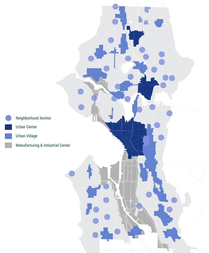 The Harrell administration’s plan largely doubles down on the way the city has grown over the past few decades. It renames, and in some cases slightly expands the existing “urban villages” where the majority of new homes have been built over that time, now calling them urban centers. And targeted upzones would be focused on 24 new “neighborhood centers” where there are existing neighborhood business districts, like in Georgetown, Maple Leaf, or Montlake, but those upzones are not planned to extend more than a block or two in any direction.