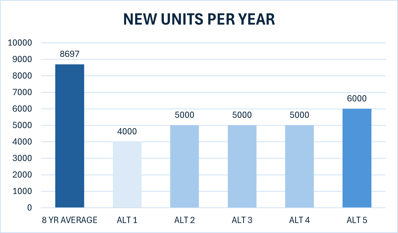 In noting how unambitious any of the proposed growth alternatives that the Harrell administration chose to study were, including the most aggressive one (Alternative 5), which the current One Seattle plan fall short of still, the commission noted that Seattle has produced on average nearly 8,700 new homes over the past 8 years. Yet even Alternative 5 targets just 6,000 homes per year over the full life of the plan.