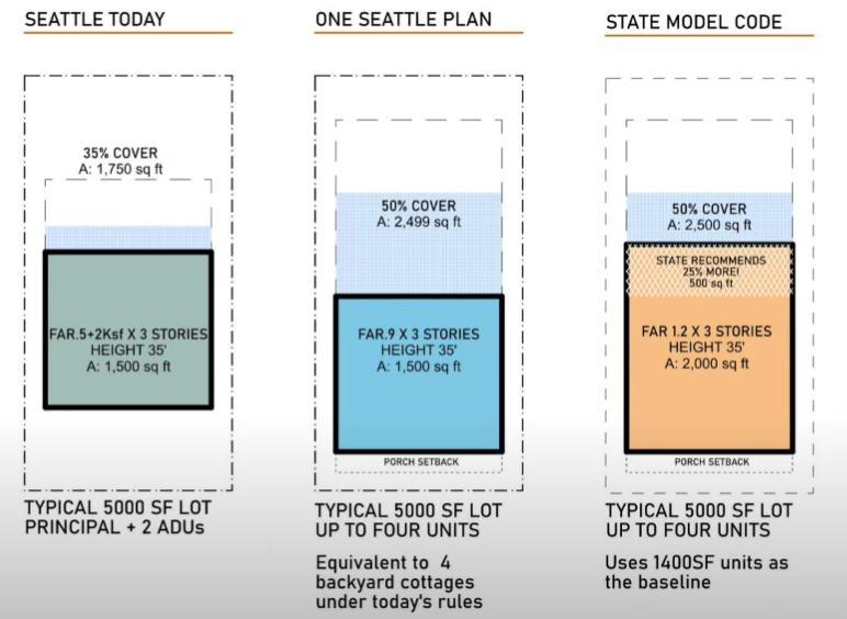 Hutchins pointed out that the state’s newly developed model code ordinance, which would take effect in any city that doesn’t adopt its own regulations to comply with HB 1110 by next summer, would allow much bigger homes than what the Harrell administration is proposing. This is likely going to have a big impact on how much “missing middle” the city actually sees developed, if it’s adopted.