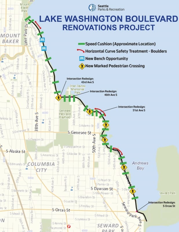 Only members of the public who had been following closely would have noticed that the new list of improvements planned for 2025 no longer includes six different sets speed bumps intended to keep driver speeds down. Nor does it include a planned intersection redesign intended to improve safety at S Orcas Street and Lake Washington Boulevard, a change that Coexist Lake Washington asserted has “no evident benefits” in an email to the City dated last May.