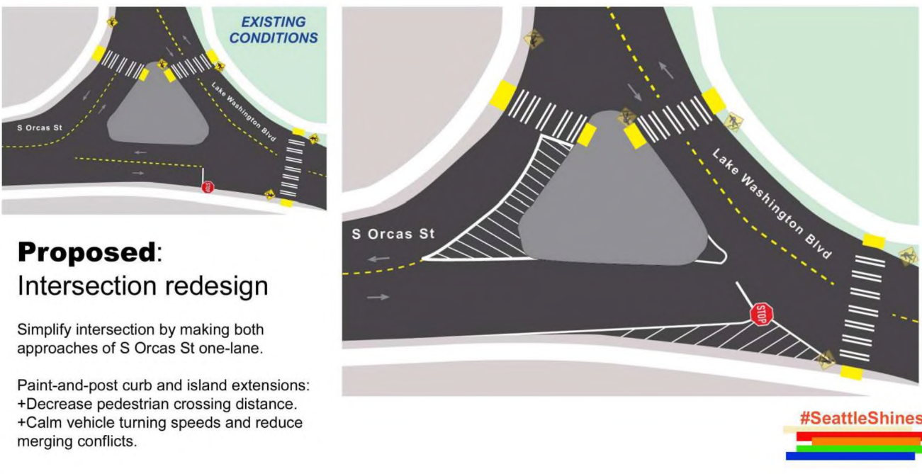 “During outreach, community suggested simplifying the intersection or remove the slip lane altogether because the slip lane is causing near-misses between vehicles,” a 2024 SDOT Complete Streets review noted. “This design proposal would remove the potential conflict from vehicles that are westbound on S Orcas S and those making the southbound to westbound movement from Lake Washington Blvd to S Orcas St using the slip lane.”