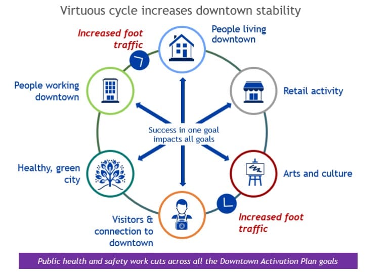 On one hand, the Downtown Activation Plan aims to crack down on fentanyl distribution, funnel more people into drug treatment, and increase emphasis patrols and cleaning crews. On the other, the plan proposes pedestrian-friendly street festivals, filling vacant storefronts, and attracting more childcare centers and schools downtown with the hope of encouraging more activity and drawing more residents to the core of the city.