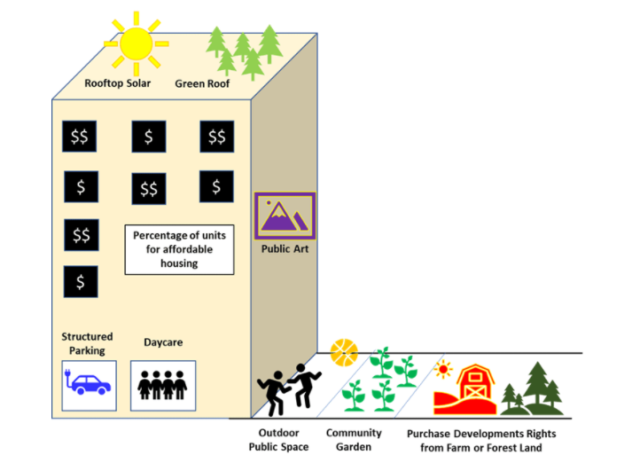 In the final land use section of the survey participants are asked to rank the importance of many different urban design elements and public amenities. This feedback will be used to help create developer incentives that may allow projects to have greater square footage or additional floors past concurrent land use regulations. Items up for ranking include rooftop solar panels, green roofs, a target percentage for units of affordable housing, whether or not to locate more than 75% of required parking within a structure, public art, daycare, indoor or outdoor public space, community gardens, and the purchase of development rights from farm or forest land. Participants are also welcome to recommend other amenities — bike facilities are among those missing.