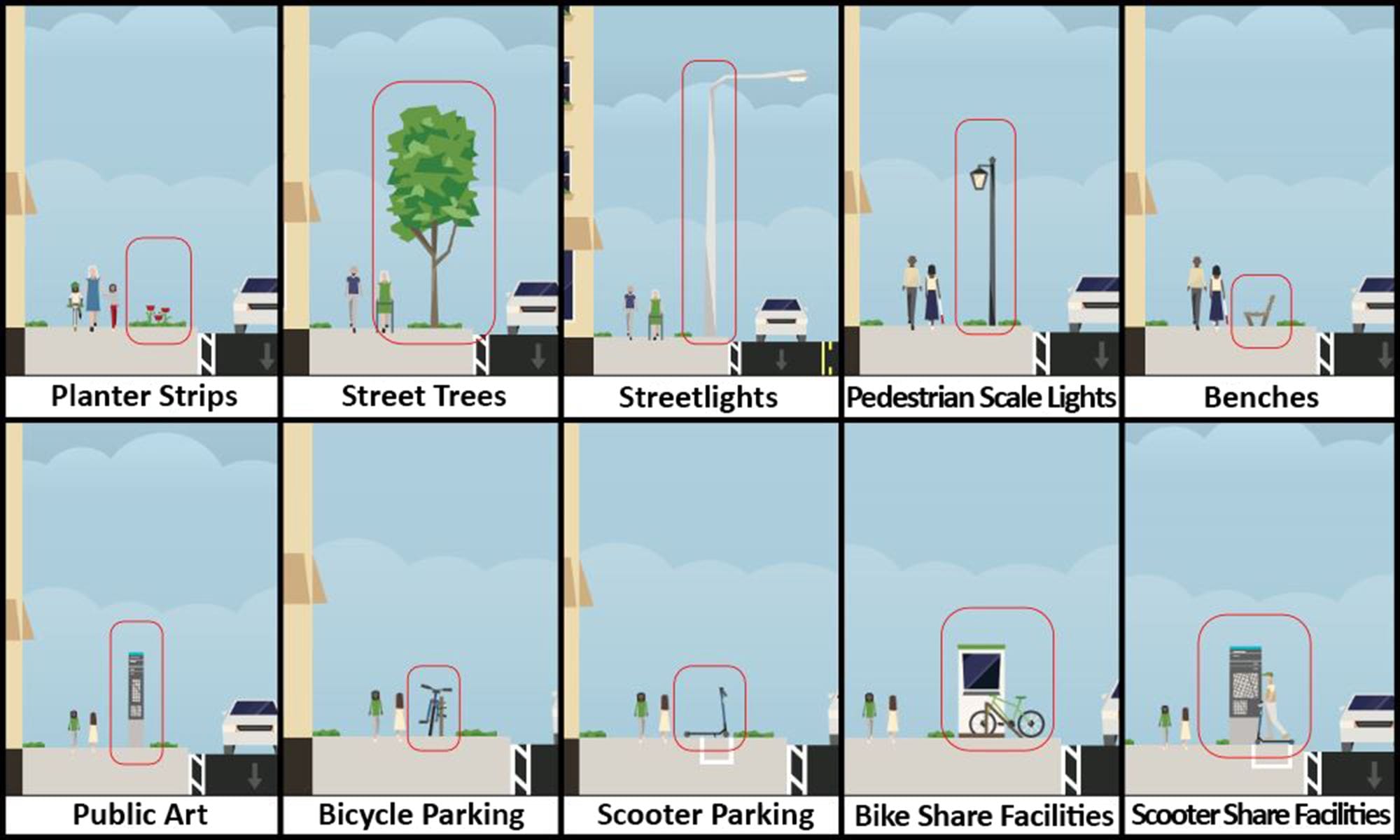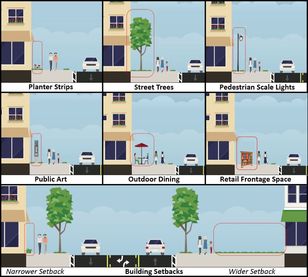 The transportation section kicks off with a sampling of currently used modes of transportation and a hypothetical that presents what transportation modes could increase with better facilities and services. With that data collected, the survey dives into participants’ thoughts on typical road cross section features in current commercial/mixed-use areas in the subarea. Afterwards, participants are asked to rank several series of features and to indicate supportiveness of and comfort with potential features in street compositions.