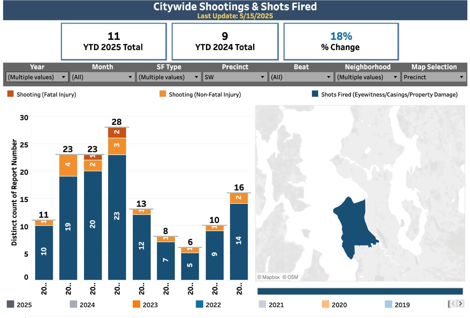 Gun violence in Seattle overall is down 30% year-to-date in 2025 compared to 2024. But in the West Seattle neighborhoods of High Point and North Delridge in 2025 year-to-date, there have been two more gun violence incidents compared to last year, an 18% increase. Gun violence first increased in these neighborhoods back in 2022 during a nationwide spike that many experts attributed to the Covid pandemic. A recent Seattle Auditor report criticized SPD’s approach to gun violence as disorganized and lacking appropriate professionalism.