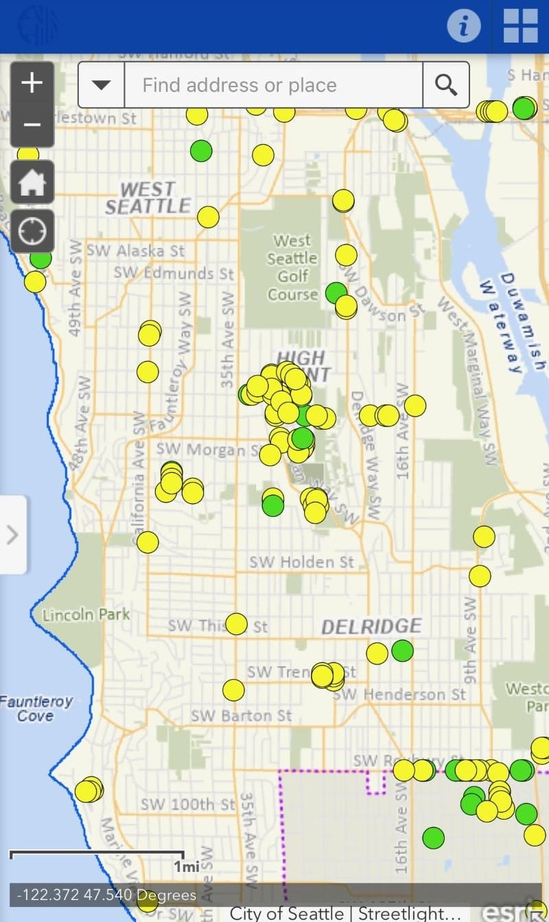 Seattle City Light confirmed that at present in High Point, there are six open green tickets and three open yellow tickets as well as a planned street light upgrade project on SW Brandon Street.