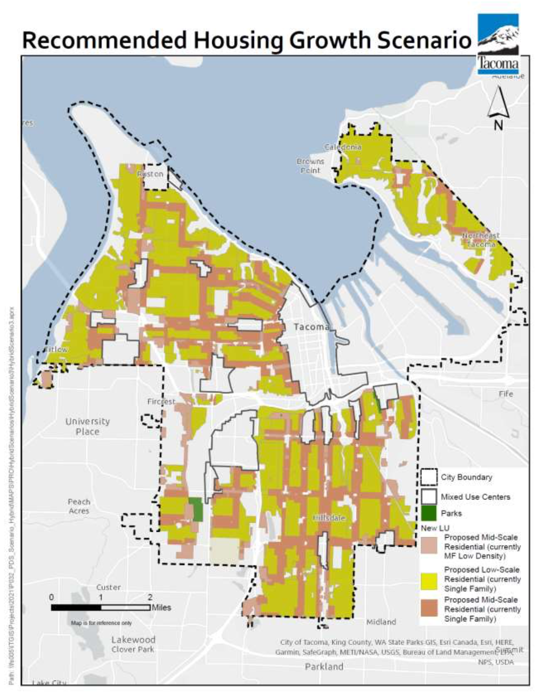 The planning commission’s recommended map revisions are essentially a hybrid of two map alternatives shared with the public in March and April. The recommended map would still direct land use and zoning changes for all areas zoned single-family and multifamily in Tacoma (all other zoned and designated areas are excluded from changes). If adopted, this would essentially end the concept of single-family zones in the city in both name and regulation. Single-family areas would be redesignated and rezoned to Low-Scale Residential or Mid-Scale Residential zoning types, which would permit a mix of housing types like duplexes, rowhouses, and apartments. Low-Density Multifamily areas would also get a boost to Mid-Scale Residential, a more intensive land use designation than the current one.