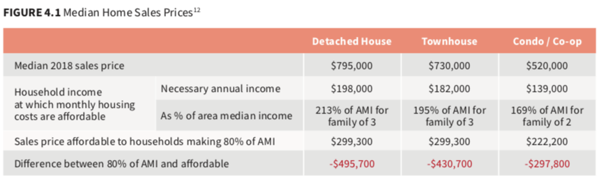 While many people would certainly welcome greater diversity in housing choices, it’s difficult to envision how the City can create policies that will ensure that such new market rate housing will be available at “various price points,” when even the median price point for condominiums cashes in at 169% of area median income for a household of two.