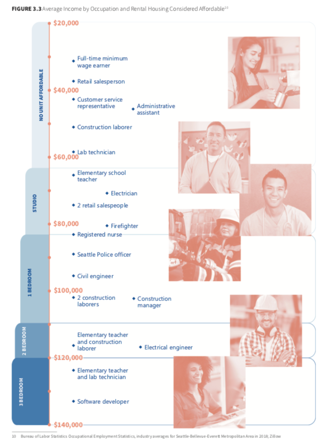 Of particular significance is the category at top of the graphic, which encompasses workers earning up to $60,000 a year. For those workers living alone or with dependents, no average market rate housing in Seattle is affordable.