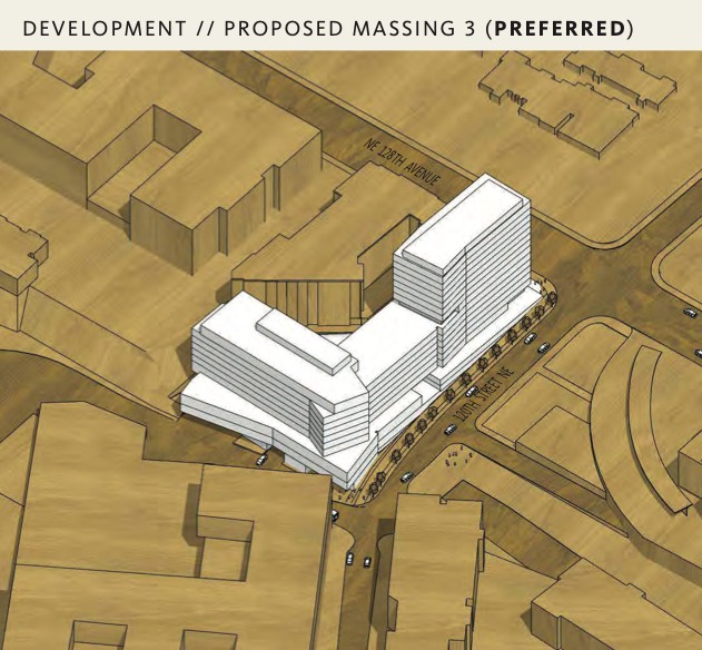 At a March 7th design review meeting, the developer and architects shared their proposed alternatives for the site, including a preferred alternative featuring an L-shaped design and the tallest tower option. The mega-block size of the lot shows in the long massing, but the architects appear to have done a good job defining each end of the building. The 16-story tower rising along NE 128th Avenue, the slightly offset massing at the opposite end, and the bridge podium between the two creates distinct segments and visual interest.