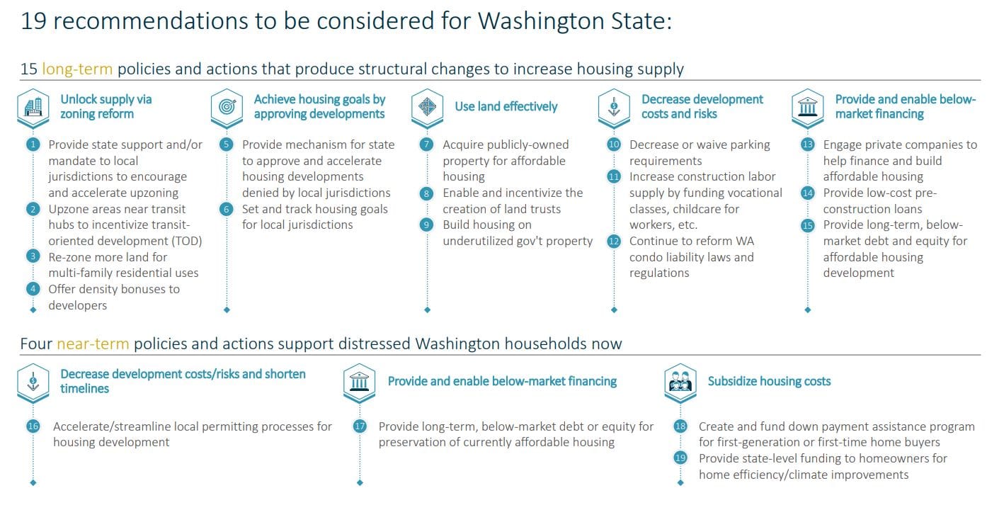 “On Zoning: >90% of Mercer Island and >70% of Seattle and Bellevue are zoned as single-family,” the executive summary continues. “Up-zoning these areas will unlock a significant amount of housing supply. To the south, California recently passed Senate Bill 6 authorizing residential housing projects in commercial corridors otherwise zoned for large retail and office buildings; by some estimates, this new law could produce up to 2.4 million new units.”