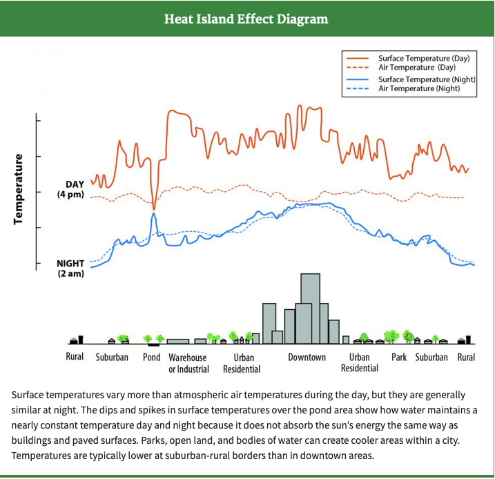 Not a pretty picture, right? The prospect of more frequent heat domes is just one more vivid reminder of the need to effectively adapt our cities to rising temperatures as we work to decrease the carbon emissions fueling the climate crisis. Rather than hide in air-conditioned buildings, which incidentally spew hot air outside, we need to learn how to live better with hotter temperatures. This situation is all the more urgent in cities where a phenomenon known as urban heat island effect can significantly ratchet temperatures up. According to data from the Environmental Protection Agency (EPA), daytime temperatures in urban areas may be 1°F to 7°F higher than temperatures in outlying areas, while nighttime temperatures may be 2°F to 5°F higher. These increases in heat are often most acutely felt in lower-income urban areas, which tend to have less tree canopy and fewer green spaces.