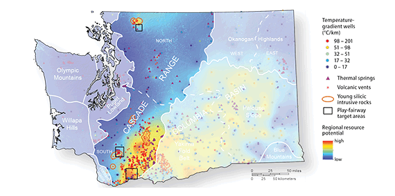 In Washington state, the Cascade mountain range is of the upmost interest to the DNR. Mount Baker, Mount St. Helens, and the Goat Rocks Volcanic Complex are among the areas predicted to have conditions suitable for electricity production.