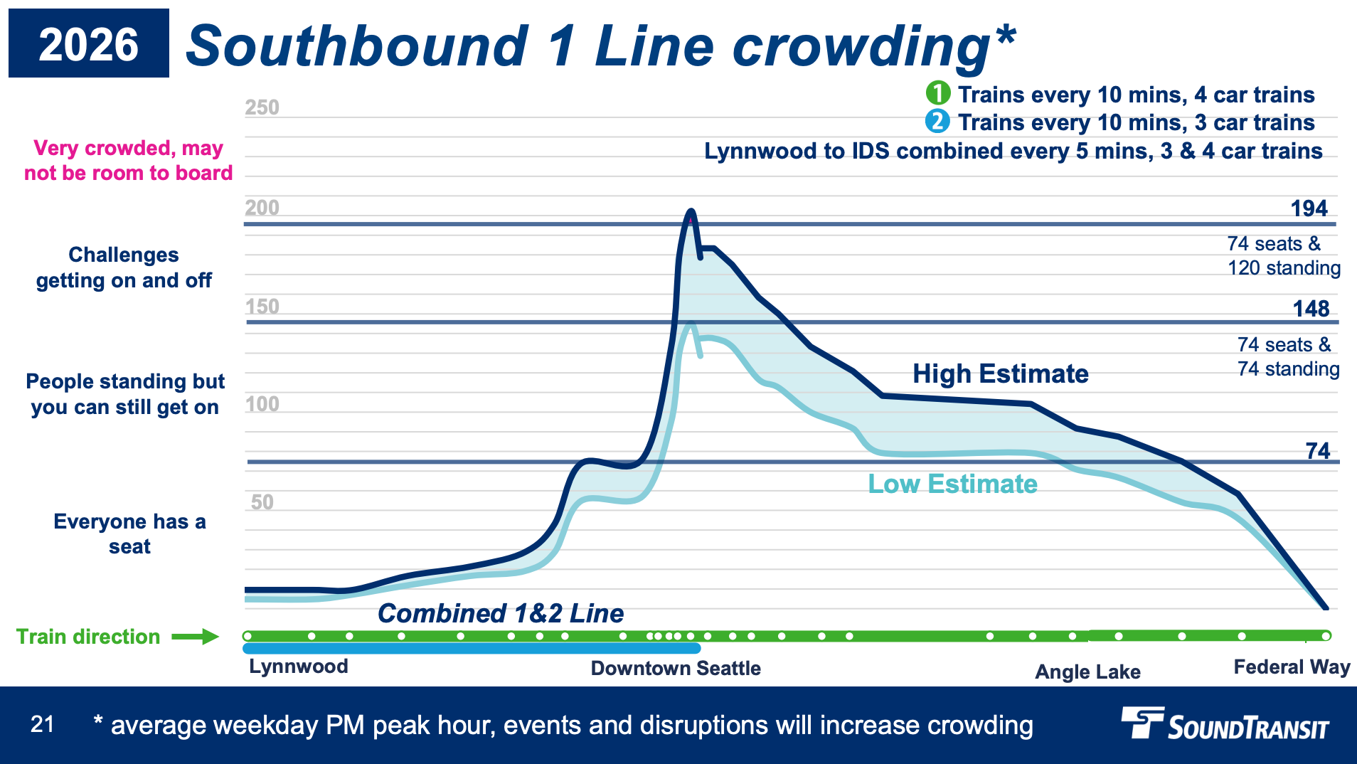 As another example, riders from Tacoma and Federal Way could have very frequent access to their main destination: the airport. The 12 Line would be overlaid on the 1 Line to offer combined frequency to the airport every 7.5 minutes. That’s far and away more frequent than bus options today, but half of the trains would continue onward to Seattle to still provide a frequent regional connection without a transfer. Riders could take a 12 Line train to the airport and then transfer to the 11 Line to continue toward Seattle with a minimal time penalty.