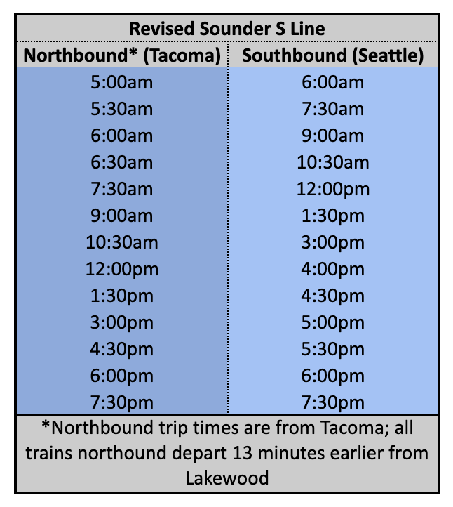 These conceptual schedules really show the combined power of blended Sounder and Cascades service on the S Line corridor. Giving riders more choice on fast rail service between Seattle, South King, and Pierce County communities could wind up being a big success and it could get the region to begin rethinking the longer-distance transit strategy. That strategy could eventually morph into elevating the priority of regional rail investments.