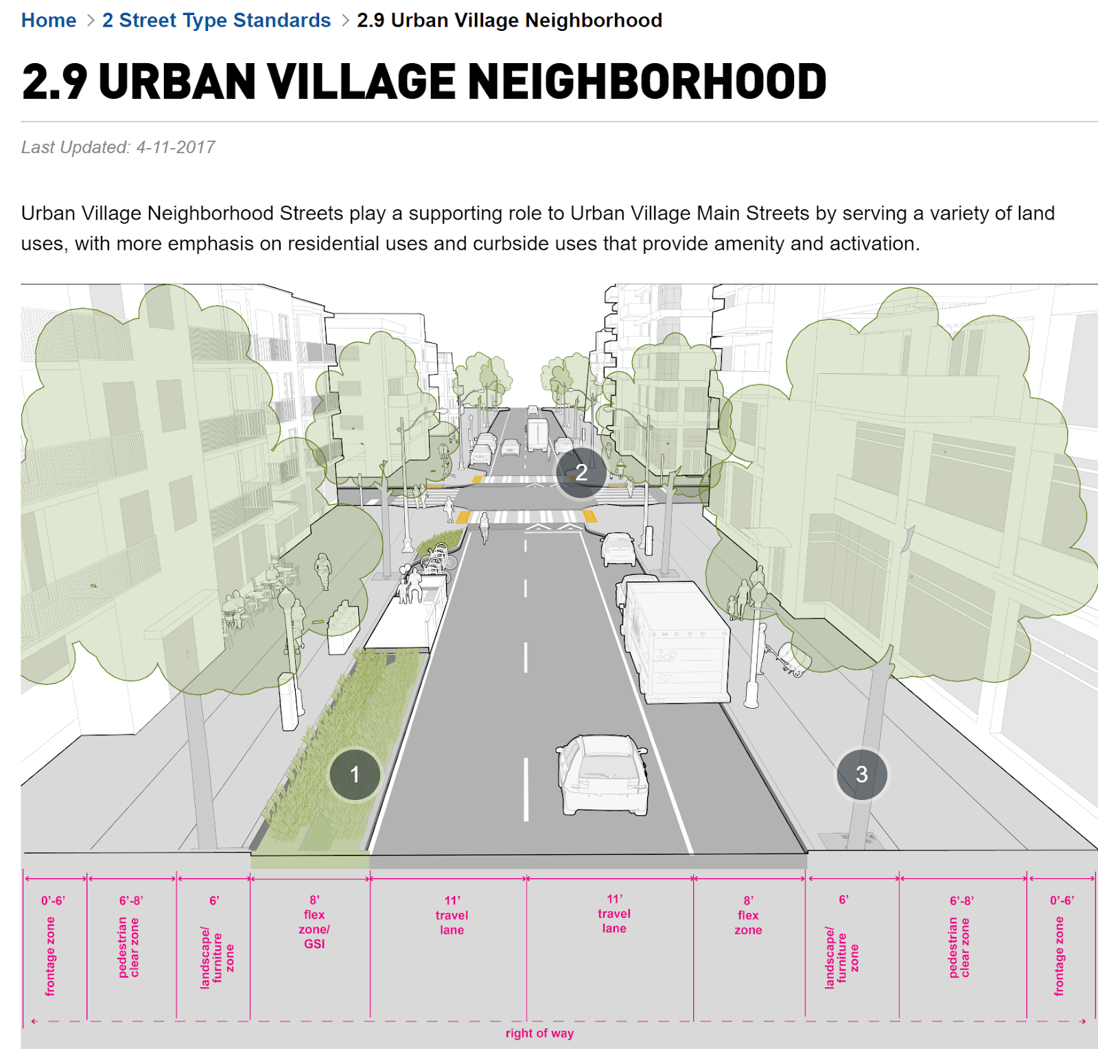Because the required design information is not provided within the PAR, and the City’s procedure is to react to permit submittals on a case-by-case basis and I, as the civil engineer, am placed in the uncomfortable position of making an educated guess for the width of both the sidewalk and planter strip in order to prepare the initial design plan for the SIP. For this project, my professional engineering conclusion was to use the Urban Village Neighborhood template for a residential street frontage design, and my initial design depicted a six-foot planter strip next to a six-foot sidewalk.