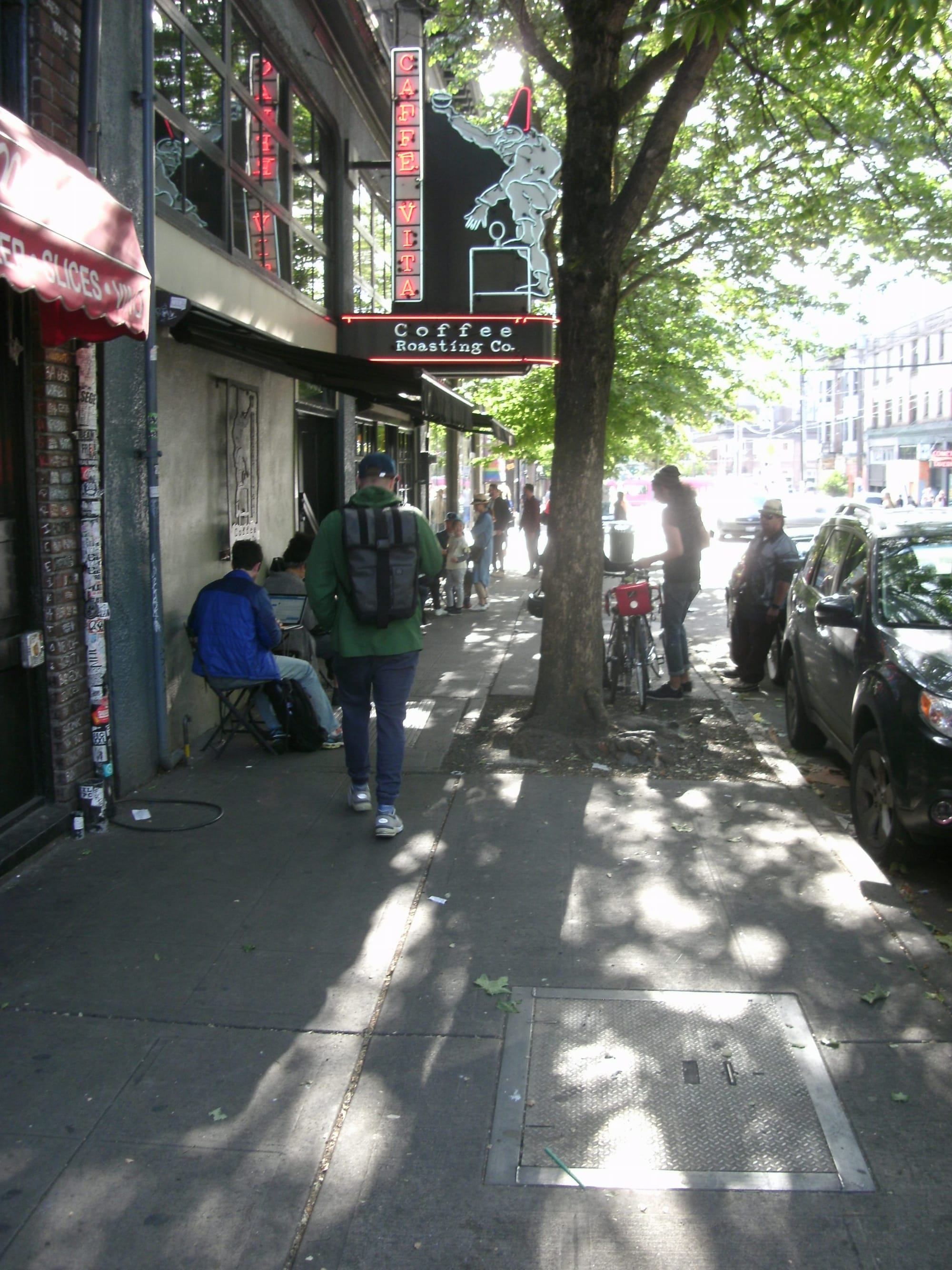 SDOT’s data shows that sidewalks are overcrowded on weekend nights on Pike Street. Volumes along the corridor are comparable to a weekday commute in Downtown, except Pike Street sidewalks are much narrower, with more obstructions, particularly in the most high-traffic areas. For example, in front of Caffe Vita where the sidewalk also has seating.