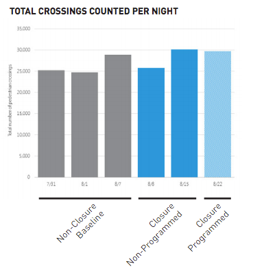 This chart shows counts for standing and sitting pedestrians along that particular stretch, during the baseline study night before the street closure pilot.